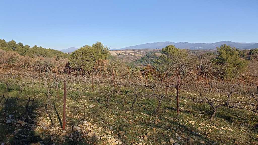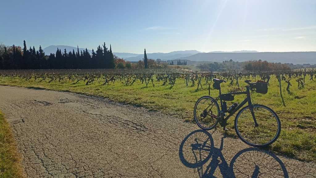 Hier, belle journée sur Valréas, nuages et éclaircies, peu de vent, 15°C aux heures chaudes. Derniers travaux de taille de haies et arbres fruitiers, sortie en voiture+remorque vers la déchetterie. Aujourd'hui, temps carrément ensoleillé, j'ai pris le vélo de voyage (mon "route" n'est pas encore réparé) pour une balade de 38km/519m+, qui a largement suffi à me fatiguer. Il y avait quelques belles côtes, dont la montée vers La Carne depuis Visan (des passages à 15-16%). Heureusement, j'ai bénéficié des petits braquets de la randonneuse, même si je n'ai pas mis "tout à gauche" (26:34!). Le 26:26 a suffi. Mais ce n'est vraiment pas la forme, il faudra de la persévérance pour la retrouver. En haut de La Carne, au-delà des vignes dénudées, la vue s'ouvre d'un côté vers le Massif de la Lance, de l'autre vers le Mont Ventoux et les Dentelles de Montmirail. -