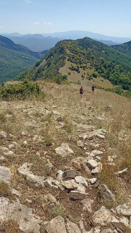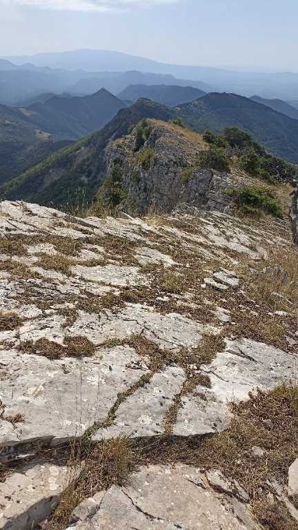 Pas de vélo aujourd'hui, après les cent bornes d'hier ; mais ce n'est pas pour cela que nous sommes restés inactifs. Avec Chérie et un de mes neveux en vacances chez nous, le programme d'aujourd'hui commençait, après un bon petit-déjeuner, par une randonnée au sommet de la Lance, ce massif montagneux qui étire sa longue crête au nord/nord-est de Valréas. Température de près de 20°C au départ à 9h, mais ciel nuageux avec très peu de vent. Les lointains n'étaient pas encore très dégagés, mais c'était beaucoup plus clair qu'en juin (le ciel était voilé de sable d'Afrique du Nord et de fumées d'incendies du Canada). -