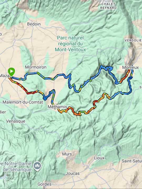 Aujourd'hui, j'ai emmené mon neveu (actuellement en vacances chez nous) à Mazan, d'où nous sommes partis pour une jolie boucle de 71km/1000m+ autour de la vallée de la Nesque. C'est, à peu de choses près, le parcours que j'avais suivi en juin avec Jean-Pierre ; un bon souvenir. Mon neveu en est rentré enchanté. La Nesque, c'est un coin tellement agréable... Pendant notre sortie, nous avons croisé beaucoup de cyclistes, parmi lesquels quelques "bike packers", une majorité de "musculaires", mais aussi un nombre incroyable de touristes d'âge mûr, parfois en troupeau mais le plus souvent en couple, sur des VAE (probablement de location). C'est toujours un paquet de bagnoles qu'on n'a pas eues à croiser ! -