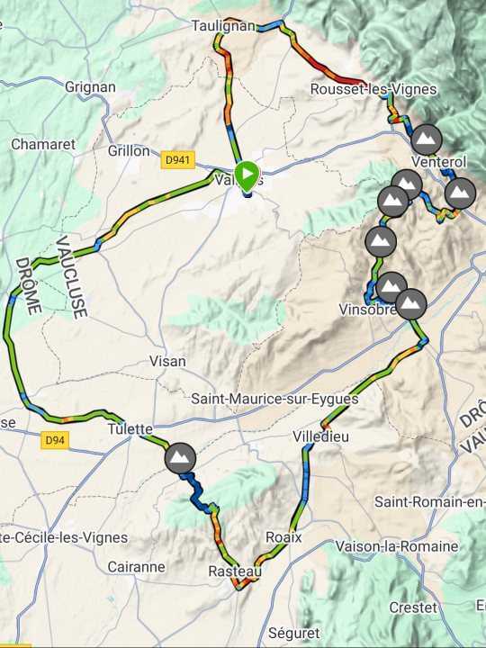 12°C à 7h30 à Valréas. Nuit plus douce, donc, en raison d'une couverture nuageuse partielle. En quittant le centre ville vers 8h10 avec les potes pour la sortie club, nous sommes entrés dans des zones plus fraîches (8°C). En fin de sortie, une petite pluie a fait son apparition. Pas de quoi terminer trempés, loin de là, mais ce changement de temps après presque un mois de sécheresse rendait les routes glissantes. -