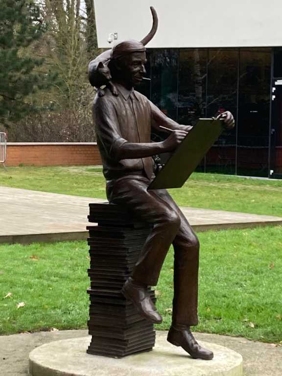 Entre moi qui préfère les sorties avec un max de côtes et les membres de ton club qui y sont apparemment allergiques… quel est le juste milieu selon toi ? Ça doit pas être évident à définir 🙂 Bon, pour ma part, 97 km aujourd'hui, direction ta région (on s'est peut-être croisés, qui sait), pour une sortie avec pour thème les trois grandes universités du coin. De chez moi, tout près de l'Université Libre de Bruxelles (ULB), direction est vers Louvain (Leuven) d'abord, siège de la KULeuven (Katholieke Universiteit Leuven) via l'autoroute cycliste F3, plate comme une crêpe bretonne (ou plutôt brabançonne). Puis j'ai obliqué vers le sud pour aller à Louvain-la-Neuve, siège de l'UCLouvain (Université Catholique de Louvain, version francophone), via un trajet bien plus vallonné, en passant par Oud-Heverlee, Sint-Agatha-Rode, Ottenburg, Wavre. À Louvain-la-Neuve, sur la Place de l'Université, dégustation d'un gros cookie au chocolat et d'un bon café bien chaud à un stand du marché de Noël qui se trouvait à cet endroit. Passage également devant le musée Hergé, devant lequel se trouve une statue sympa de l'auteur de Tintin (photo un peu ratée, on ne voit pas bien les traits de Georges Remi — le vrai nom d'Hergé). Et puis retour à Bruxelles via la N275, elle aussi bien bosselée : Céroux-Mousty, Limelette, Rixensart, Genval, La Hulpe, Hoeilaart, forêt de Soignes… Temps toujours aussi gris, froid (départ à 4°, arrivée à 8°), mais encore sec. Vent suffisant pour me faire garder un imper par dessus la veste hivernale pendant toute la sortie. Dire que j'ai croisé certains cyclistes en cuissard court et sans gants… et sans imper ou coupe-vent. Il y en a qui se sentent visiblement comme des poissons dans l'eau par ces conditions… -