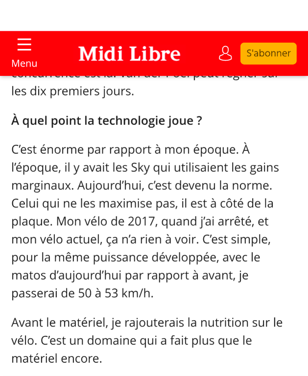 Bernard LUC Posté il y a 10 heures Posté il y a 10 heures trés etonnants les propos de Voeckler, car 2017 c'etait meme pas hier, c'etait tout à l'heure. qu'ont donc de si nouveau les velos de route (c'est bien de la route dont il parle ?) pour gagner 3 kmh en seulement 7 ou 8 ans ??!! et en plus, sur une course de 4 ou 5 heures de plat ou legerement valloné, en peloton de 200 mecs ou groupes de 50, les coureurs adoptent une position ordinaire sur le velo, ils ne font pas toute la course couchés, à plat ventre ..... 1