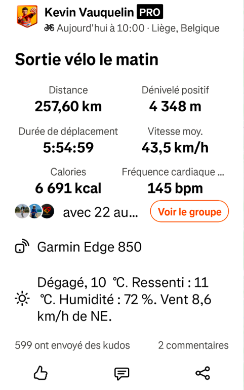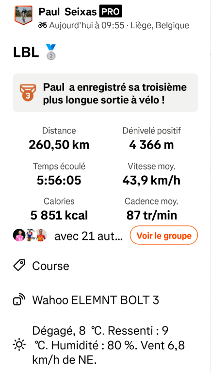 Sylvain KARLE Posté il y a 2 heures Auteur Posté il y a 2 heures Moyenne record pulvérisé sur LBL 49,3 km/h .....